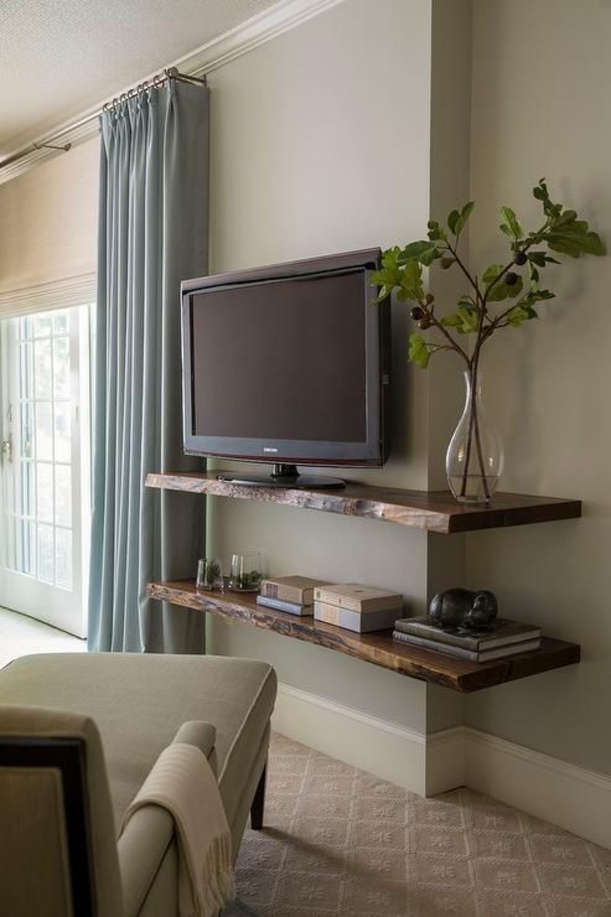 Мало того, что за этими предметами удобно ухаживать одновременно, так еще и плавающий эффект подвесного телевизора отражает внешний вид парящих полок, что действительно поднимает эстетику вашей полки на новый уровень.