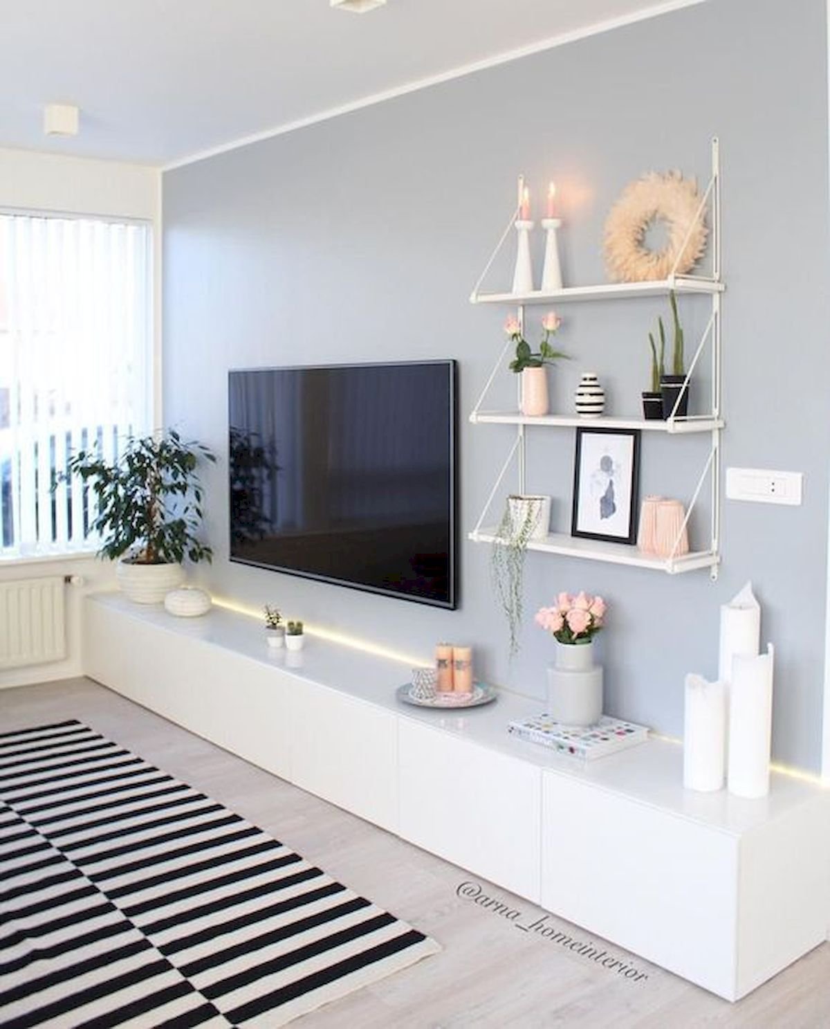 Добавление плавающих полок вокруг телевизора — отличный способ сбалансировать роль телевизора в общем декоре.