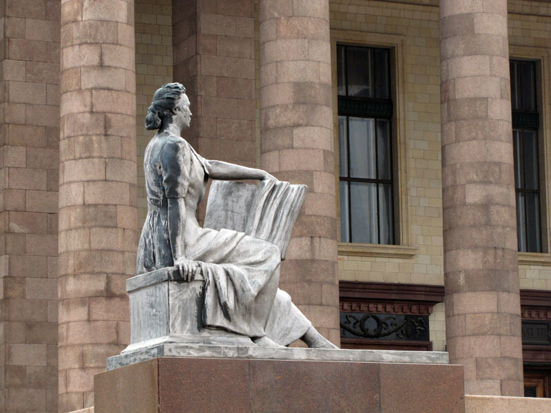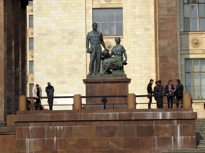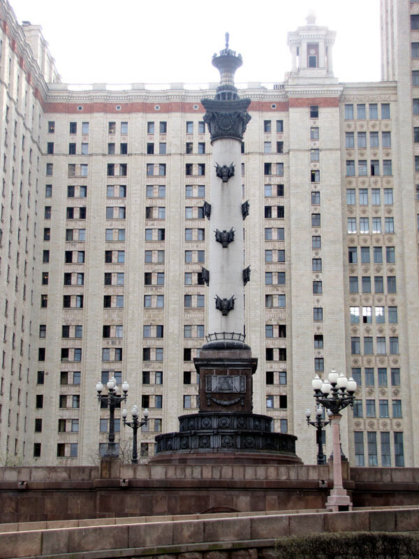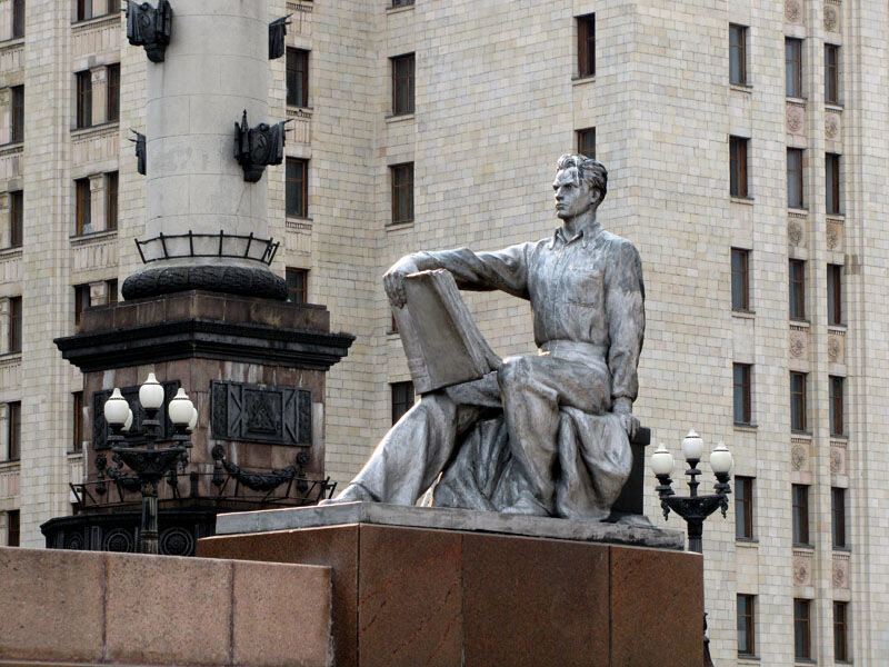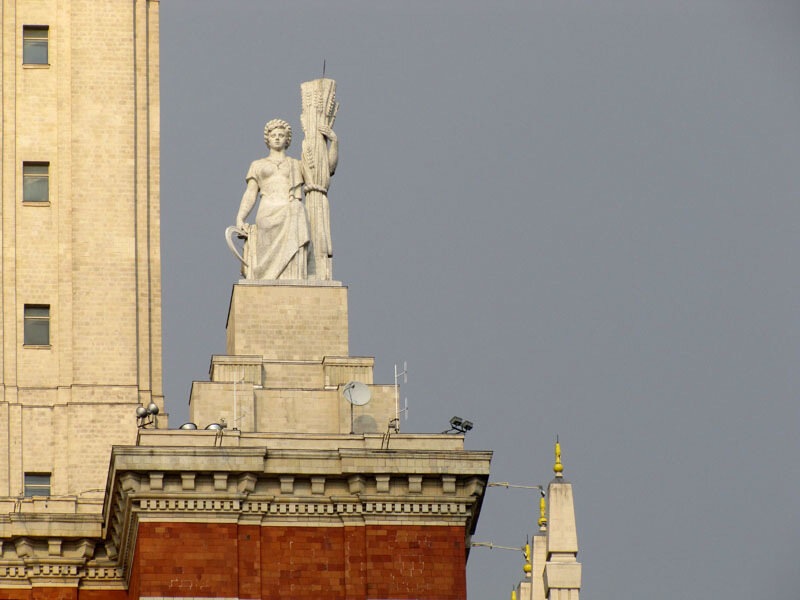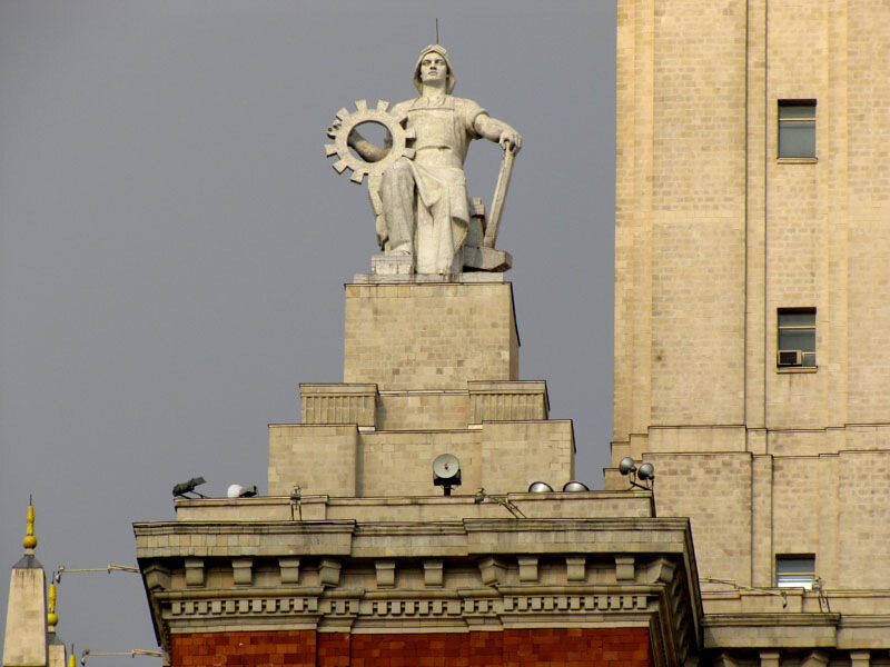 Достопримечательность ГЗ МГУ - скульптуры, в основном работы Веры Мухиной (автор "Рабочего и Колхозницы" и вообще один из лучших советских скульпторов). Например, у главного входа: