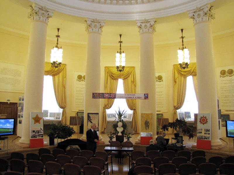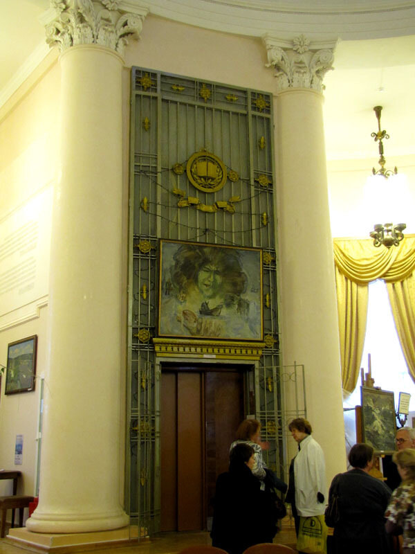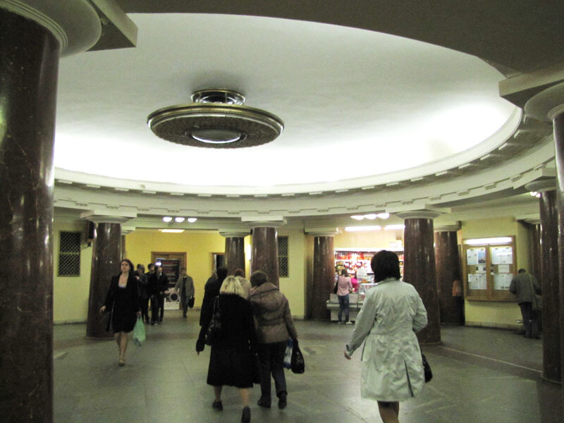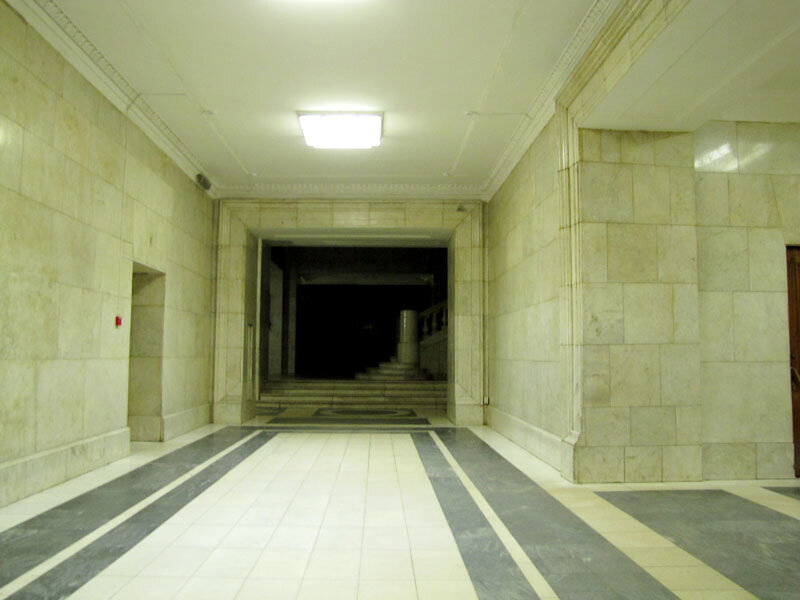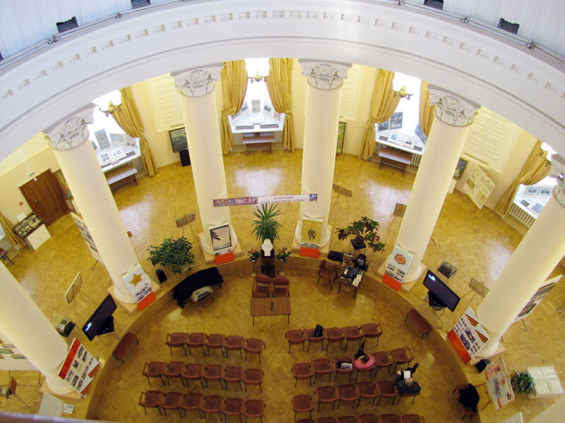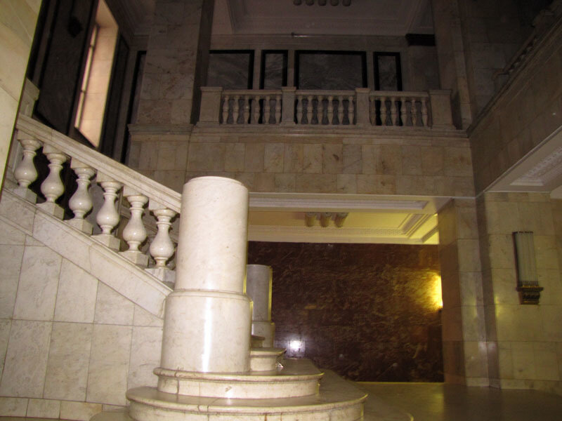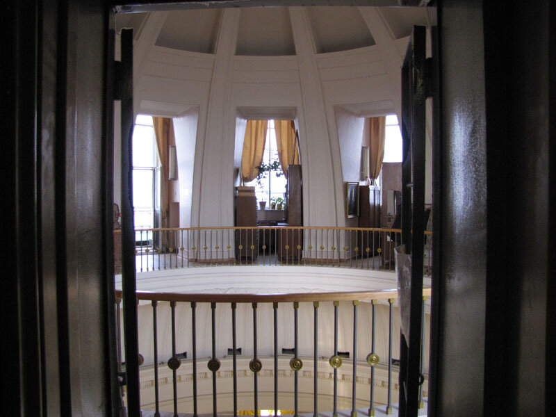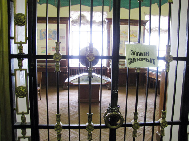 Это Музей Землеведения - один из лучших естественно-научных музеев Москвы. О нём тоже можно сделать отдельный пост, но я его в этот осмотреть не успел (хотя бывал там не раз). Из окна за глобусом и были сняты панорамы, о которых пойдёт речь в следующем посте. Попасть сюда постороннему можно, увы, только с экскурсией или хотя бы пропуском - но пропуск получить сложно. Не пустить на доклад могут теоретически не только слушателя, но и докладчика.С 28 этажа ходит отдельный лифт, вход на который тоже только с разрешения. Он приводит в Ротонду:Выход на 31-этаж - внизу Ротонды: