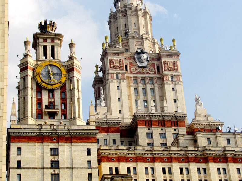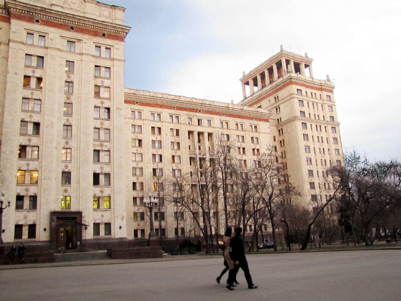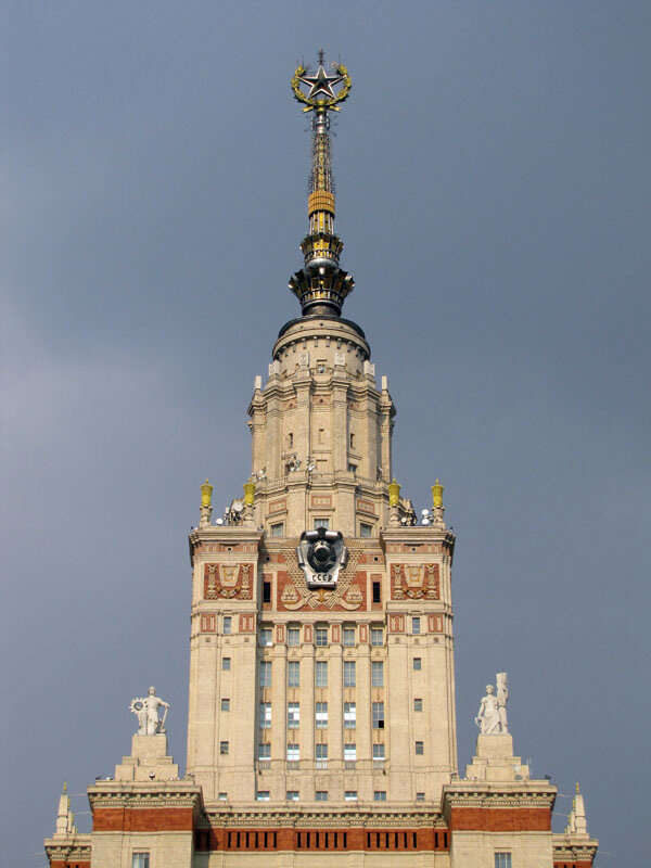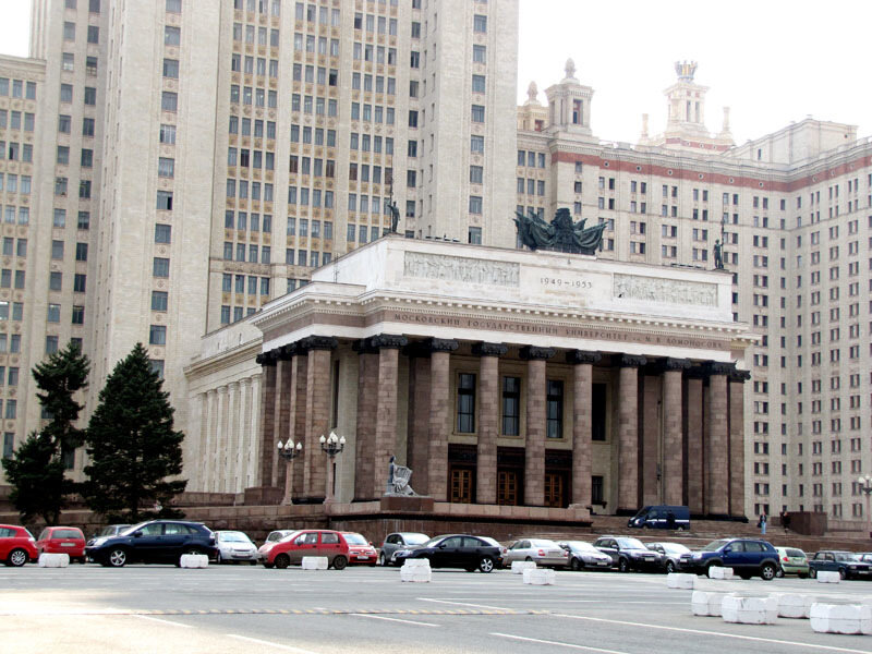Главное здание Московского университета было построено в 1949-53 годах, над ним работали такие знаковые архитекторы, как Б. Иофан, Л. Руднев, С. Чернышев, П. Абросимов, А. Хряков, В. Насонов. В первую очередь ГЗ считается произведение Руднева, так как Иофан был смещен с должности главного архитектора в процессе строительства. Высота здания от основания до верхушки шпиля - 240м, в нём 36 этажей, причём довольно широко растиражирован в 1990-е годы факт: это самое высокое в мире здание, построенно подневольным трудом, так как на строительстве ГЗ МГУ работали в основном заключенные.