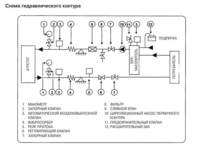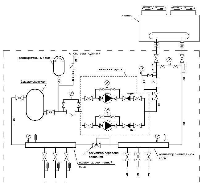 В зависимости от марки и модели чиллера монтаж гидравлического контура может иметь свои особенности, которые указаны в сопроводительной документации и должны быть заранее предусмотрены в проекте. Ниже мы приводим традиционную схему обвязки. Даже в случае ее усложнения и добавления дополнительных регулирующих/запорных элементов принципиальный порядок расстановки оборудования останется прежним.