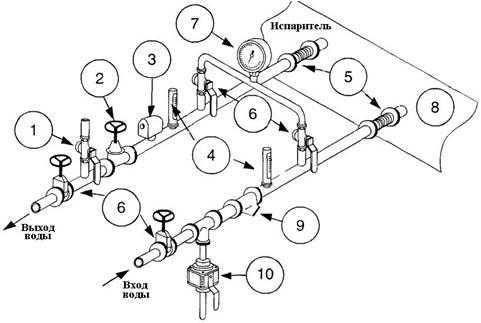 Перед заполнением гидравлического контура водой, необходимо удостовериться в его пригодности – удалить все возможные загрязнения и посторонние предметы – они могут нарушить работу испарителя. Затем контур необходимо тщательно промыть. При промывке линии поток рекомендуется пустить в обход агрегата.