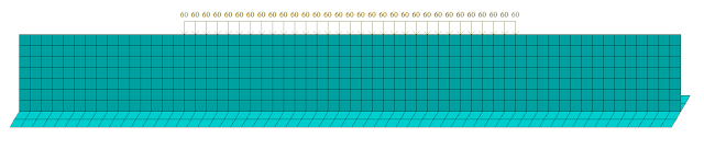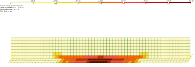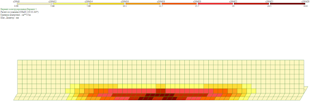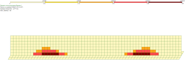 Для проверки результатов расчета я сделал схему из стержневых КЭ. Все габариты сечений и нагрузки принял такими же. В результате получил следующее армирование в середине фундамента