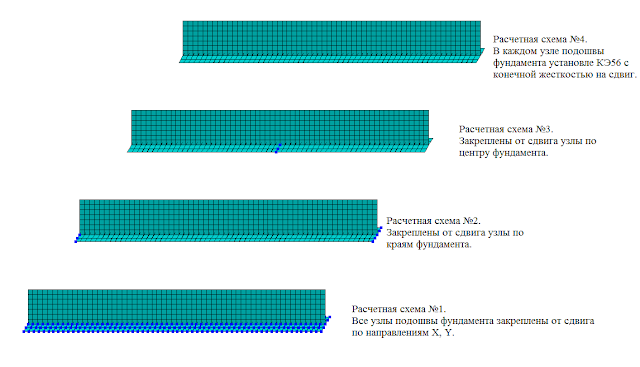 Для того чтобы показать как влияет закрепление фундамента от сдвига на результаты расчета я сделал несколько одинаковых расчетных схем с разным закреплением подошвы фундамента.