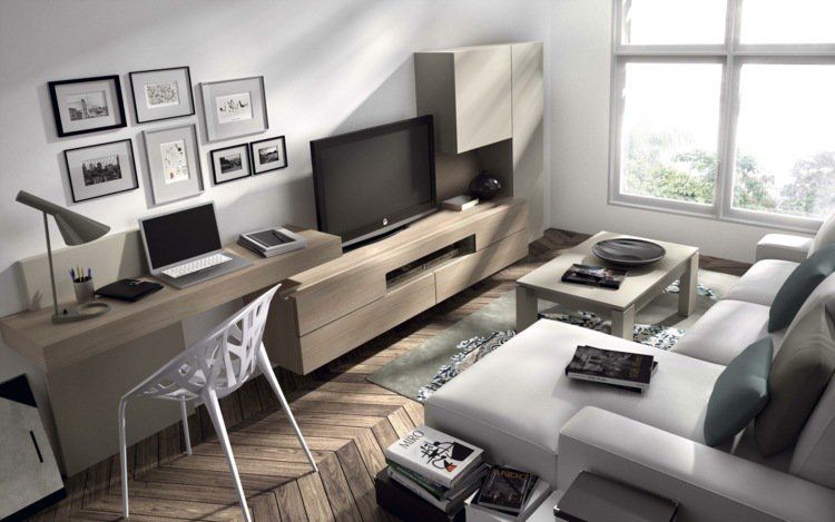 дивана, если нет телевизора. Вы также можете разместить свой письменный стол у окна (особенно если это эркер или эркер с естественной нишей) или выбрать настенный или встроенный, если у вас есть такая возможность. Консольный стол может использоваться как узкий письменный стол, или вы можете купить отдельный письменный стол, если у вас нет подходящей консоли или вам нужно больше места. И опять же, в плане мебели подберите для комнаты что-то целостное, чтобы помещения сливались в одно и не слишком разделялись, это придаст вашей гостиной более гармоничный вид. Вдохновиться!