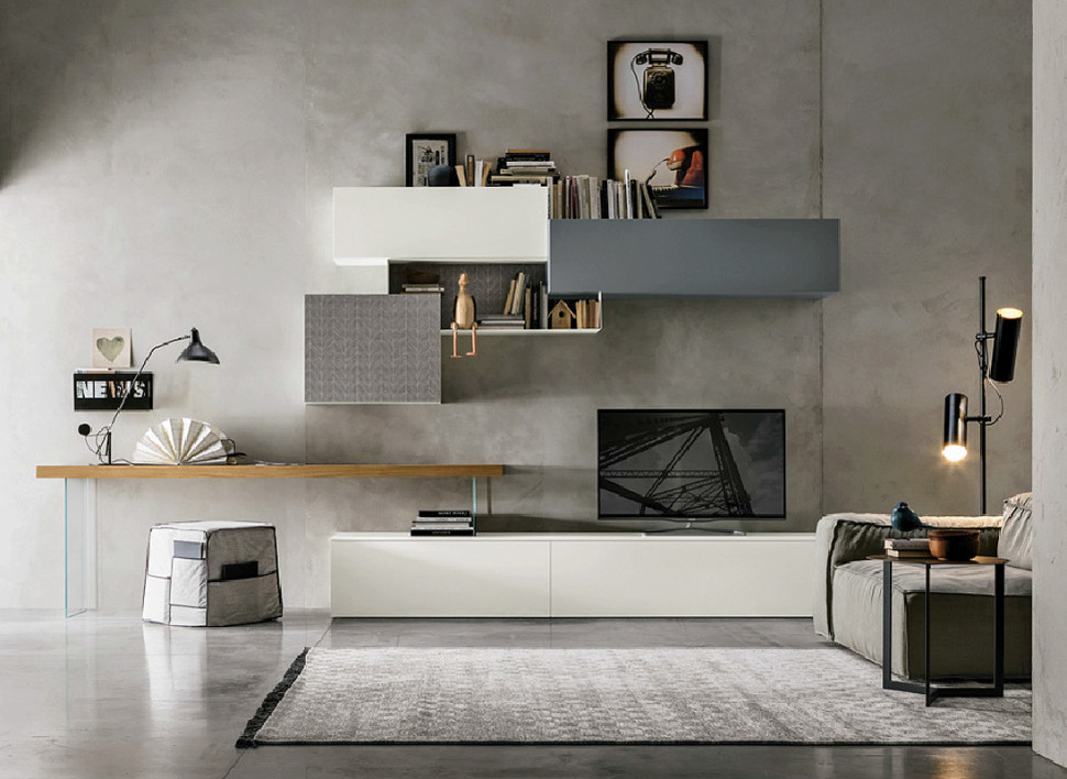 минималистская гостиная с серым диваном, элегантным письменным столом с открытой полкой, кожаным креслом и бра
