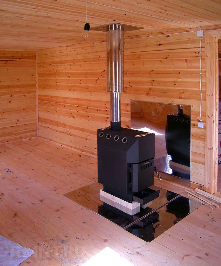 Если позволяют размеры комнаты, можно установить ванну по центру. Для деревянного дома такое расположение очень удобно и практично. Стены в этом случае не соприкасаются с водой, что значительно продлевает срок службы их отделки