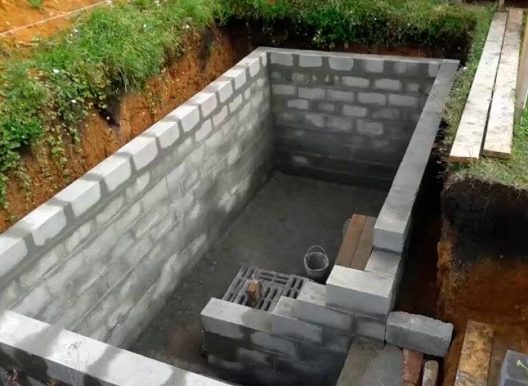 Полузаглубленный котлован глубиной не более 1 м выкладывается из кирпича, шлакоблоков, конструкция требует обязательной изоляции от воды.