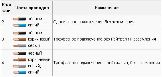 - Заземление — зеленый, зеленый с желтой полосой или оголенный провод