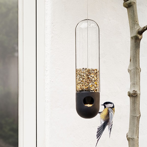 Повесьте его на чистое окно и наполните лоток птичьим кормом.
