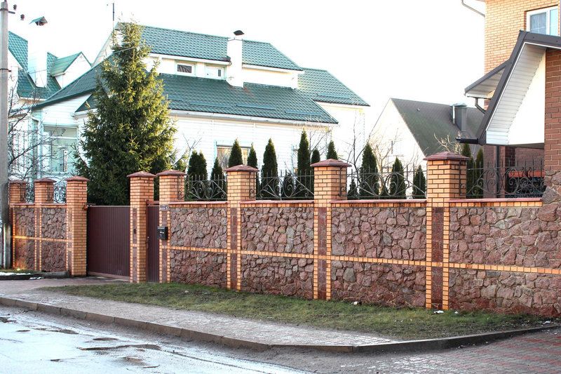 Камень отлично сочетается с другими материалами, он способен облагородить их. К примеру, забор из профлиста с кирпичными столбами выглядит куда интереснее простого ограждения из профнастила.