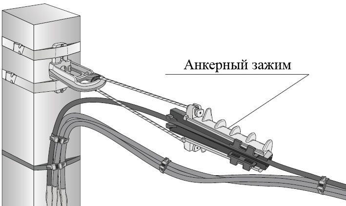 Когда кабель вместе с трос-лидером минует последнюю опору пролёта, на первом анкерном столбе СИП закрепляют в зажиме, оставив достаточно провода для дальнейшего соединения с другим пролётом, подводом к дому.