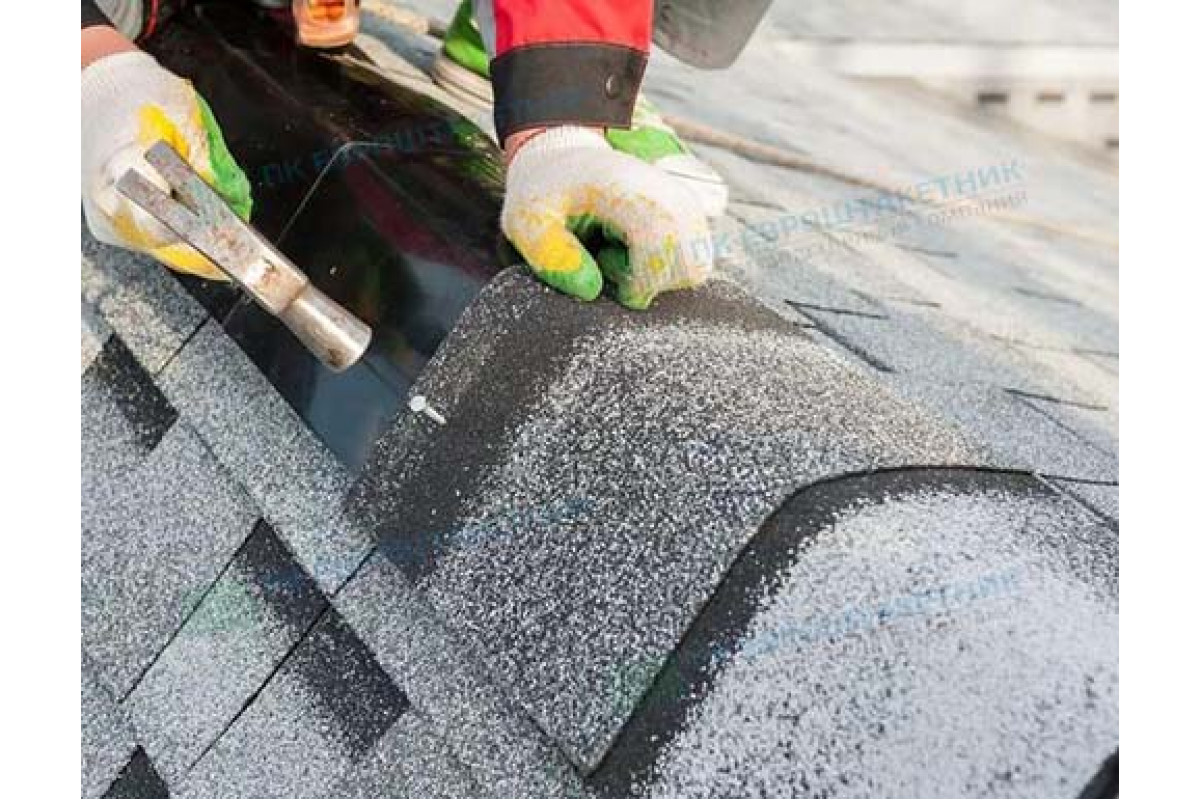 Каждый его сегмент закрепляют с помощью удлиненных кровельных гвоздей или шурупов, вкручиваемых через готовые заводские отверстия. При этом сегменты соединяют и друг с другом, как детали конструктора. - Накрывают профиль аэратора коньковой черепицей. Ее лепестки монтируют внахлест, по обычному способу, не отличающемуся от технологии ее укладки вдоль ребер. Единственное отличие заключается в элементах крепления. В данном случае черепицу прибивают к аэратору удлиненными кровельными гвоздями