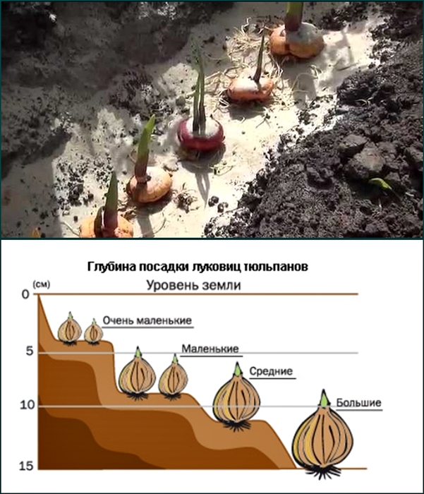 Чем больше луковица, тем глубже ее закапывают. Мелкие луковички садят на глубину около 10 см. Если луковица большая, можно увеличить глубину до 15 см.