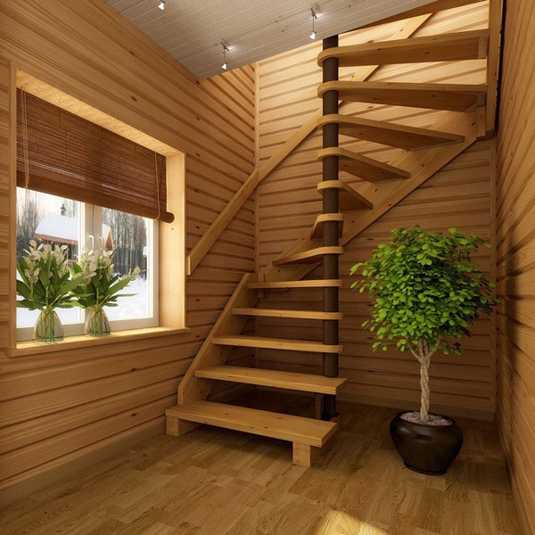 Принцип таких конструкций очень прост: на установленный стержень крепятся ступени, которые по спирали поднимаются вверх. Они не занимают лишнее пространство и достаточно компактны.