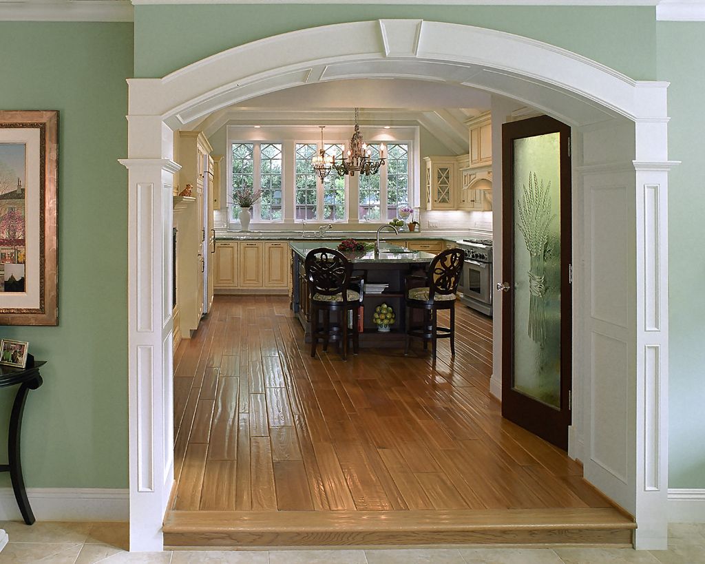 В больших частных домах красиво отделанный вход в кухонное помещение из холла или гостиной может быть целым произведением искусства и украшением интерьера.