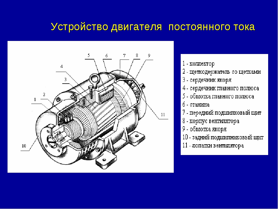 Теоретически одна и та же машина постоянного тока может использоваться как двигатель или генератор. Поэтому конструкция двигателя постоянного тока такая же, как у генератора постоянного тока.