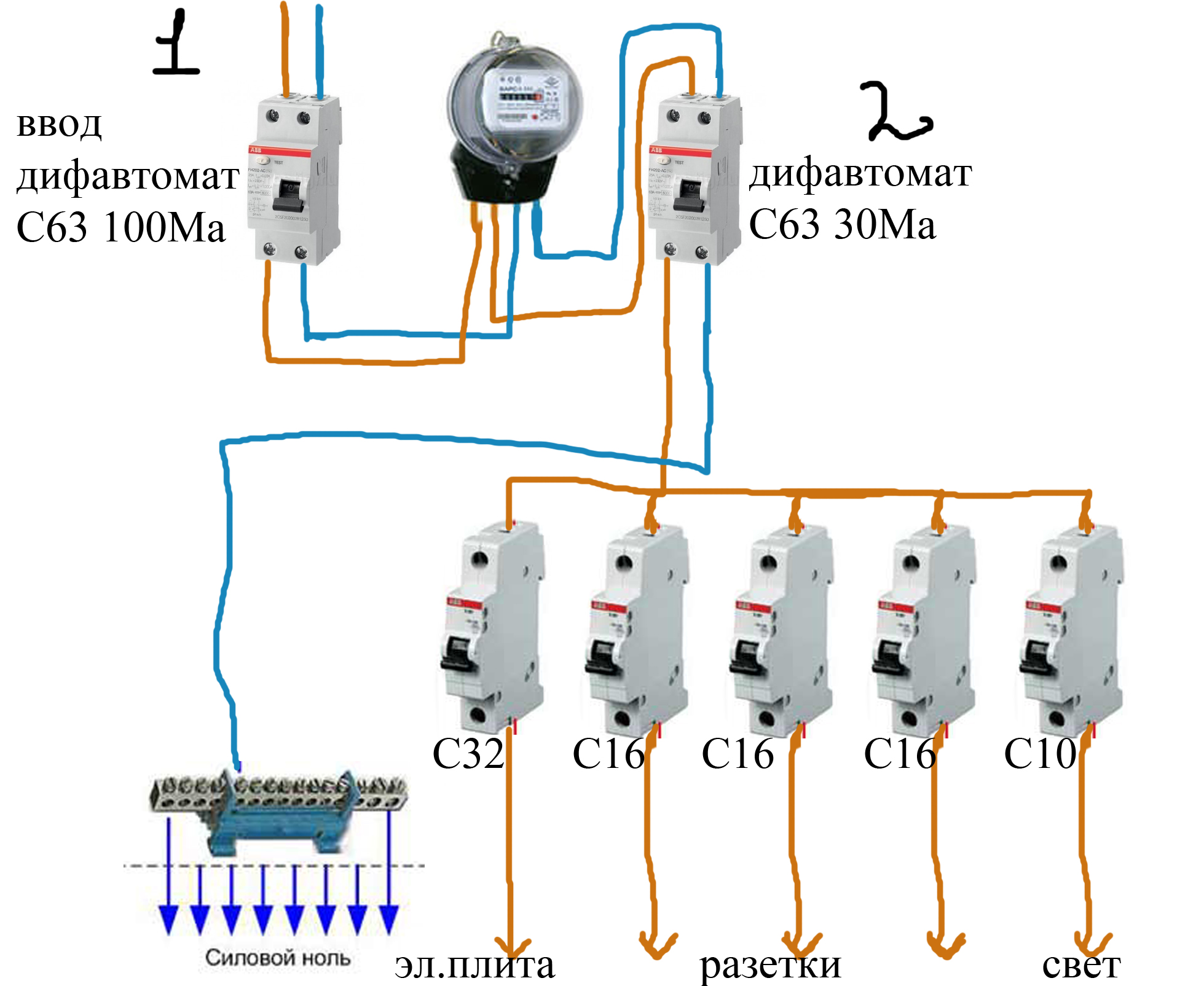 При монтаже схемы с дополнительными защитными приборами на каждую группу коммутируют автоматы по следующему принципу: