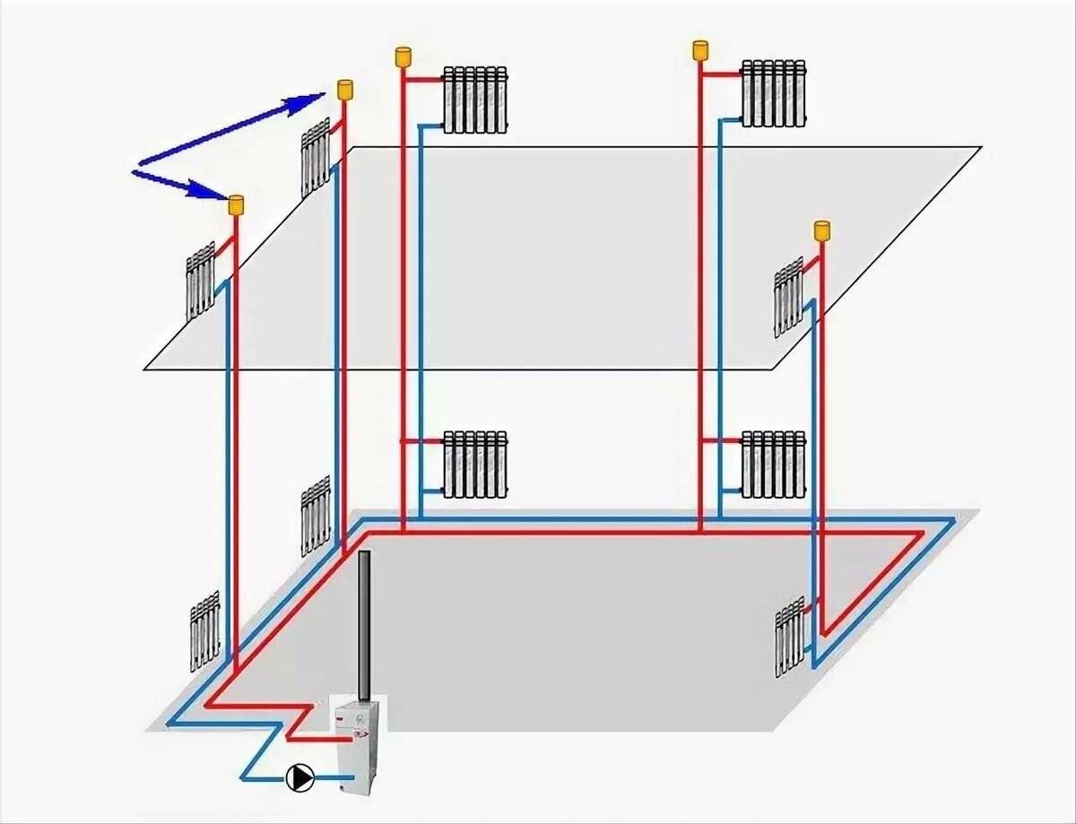 Двухтрубная схема разводки обеспечивает равномерный нагрев радиаторов в системе, что определяет ее эффективность. Конструкция представляет собой входящие в радиатор две трубы, одна из которых является подающей нагретый теплоноситель, а другая — отводящей остывший. При этом существует несколько вариаций двухтрубных схем, каждая из которых обладает определенными преимуществами.
