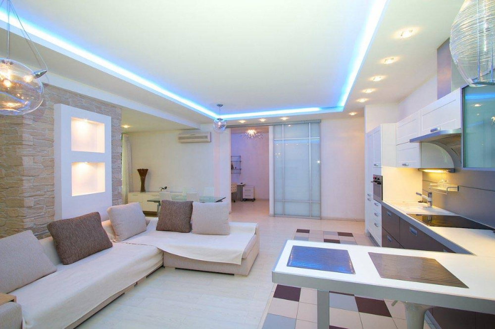 Этот, ставший привычным, элемент пользуется устойчивой популярностью. Специфика устройства таких потолков допускает их монтаж на завершающем этапе всех мероприятий, после поклейки обоев или покраски стенных поверхностей. Установку потолка можно считать чистовым мероприятием, не несущим угрозы повреждения покрытию пола или стен.