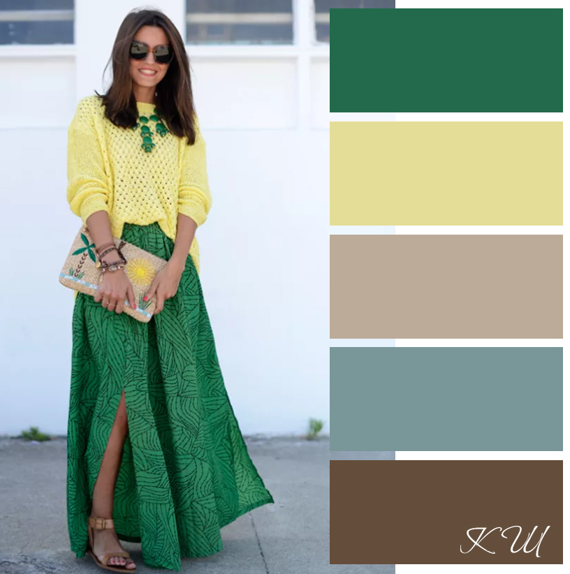 Желто-зеленый сочетается с теплым зеленым: бледно-зеленым, шартрезом, болотным,