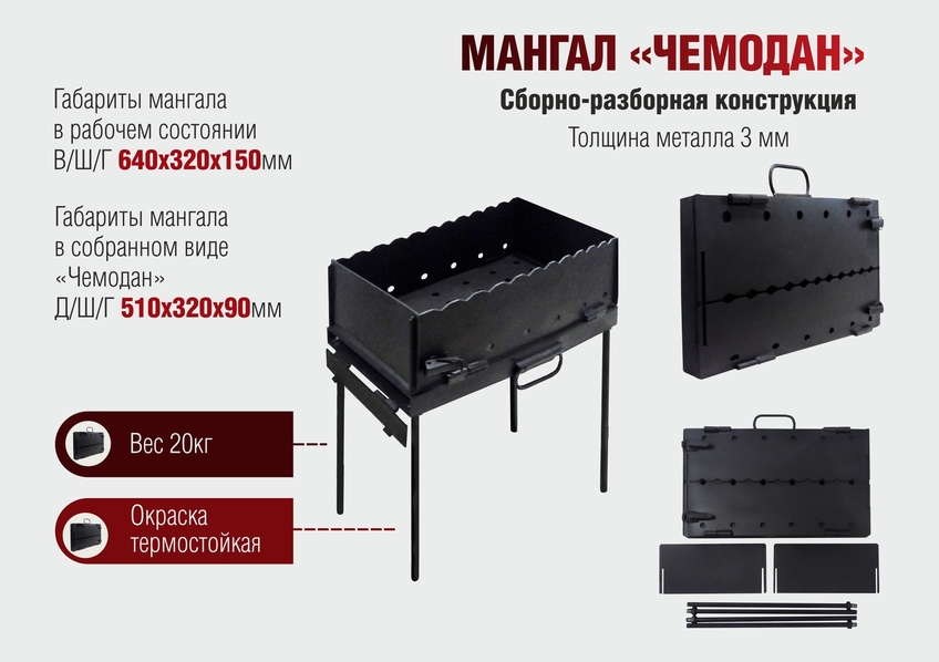 Одни из самых распространенных переносных конструкций. Толщина стали для мангала 3-4 мм. считается нормальной. Мангал еще достаточно легкий, при этом более долговечный. Но такое изделие уже невозможно долго носить в руках – это вариант либо для автомобиля, либо в качестве выносного оборудования в частном доме, на даче.