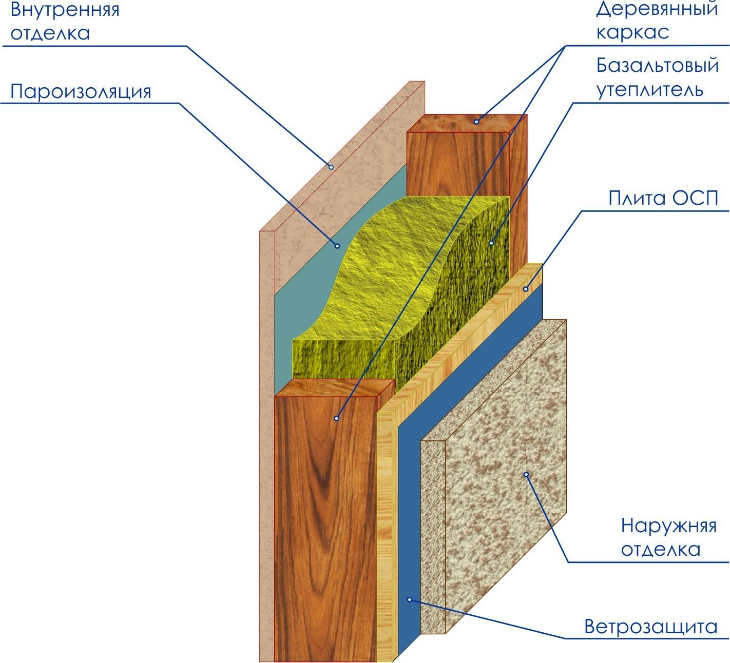 Схема утепления стены каркасного дома с отделкой ориентированно-стружечными плитами (ОСП) снаружи и изнутри.