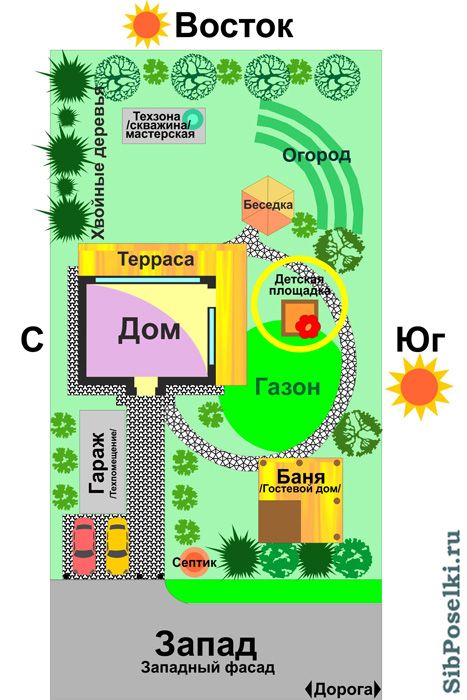 Юг лучше оставить плодовым деревьям, которые любят солнце и тепло: яблоням, грушам, вишне. Ягодные кустарники, теплицы — всё это должно быть на южной части территории.