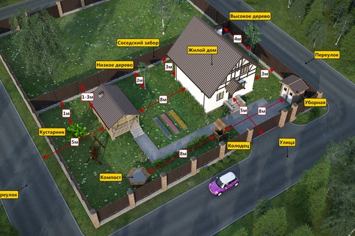 Далее необходимо спланировать расположение на участке иных сооружений и коммуникаций. Их местоположение основывается на образе жизни и предпочтениях семьи. Если дом расположен в городской черте, то на участке