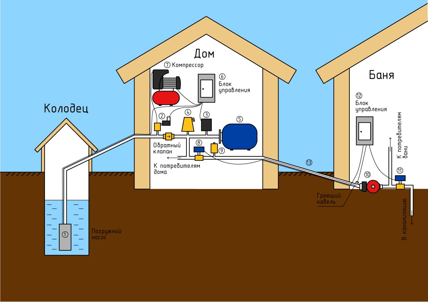 Водопровод из колодца — схема распределенияКак организовать водопровод из колодца — схематический рисунокВодоснабжение из колодца — принцип устройства