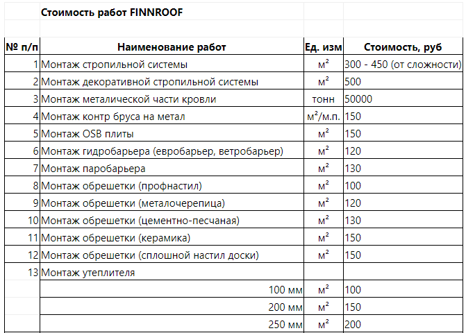 NB! Обращаем ваше внимание, что указанные в прайс-листе расценки на кровельные работы и другие представленные на данном сайте материалы по строительству и монтажным работам, ни при каких обстоятельствах не являются публичной офертой и носят информационный характер. Для определения точных цен на монтаж кровли необходимо обратиться к нашим специалистам.