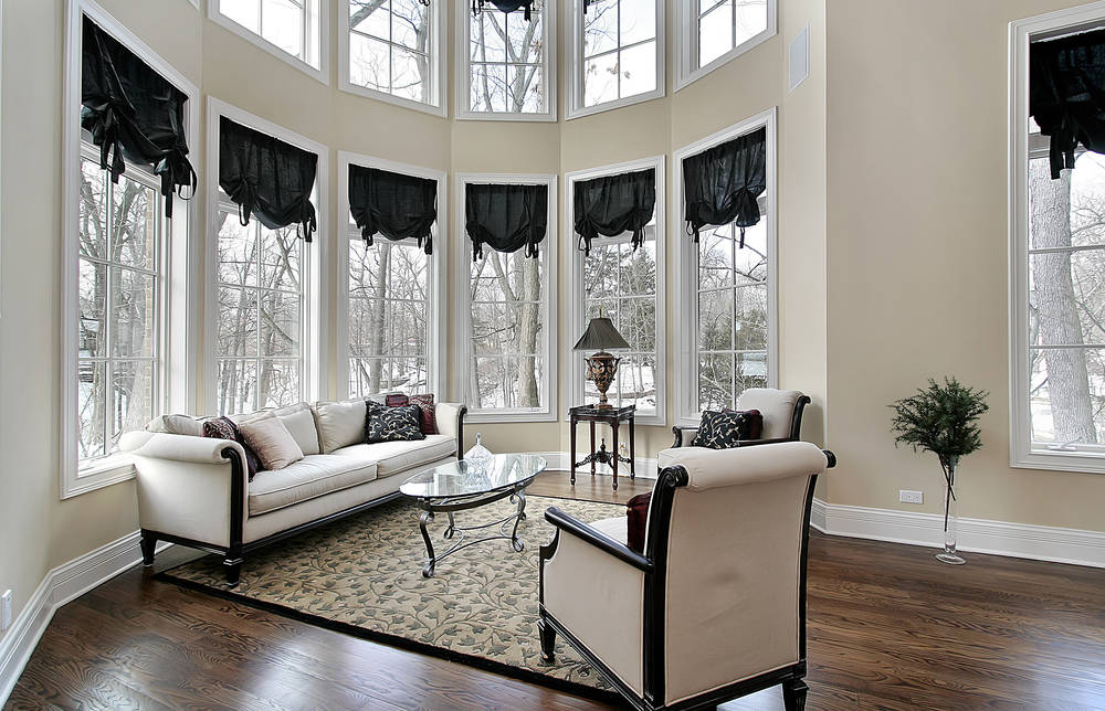 При необходимости можно зашторивать окна, что, к сожалению, лишает крупногабаритное остекление части очарования. Шторы на большие окна тоже непростая вещь, включая уход за ними. Требуются нестандартные модели, индивидуальный пошив или комбинированные решения. К тому же, всё это требует дополнительных расходов.