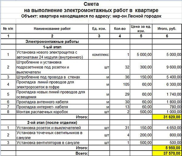 Рассмотрим пример сметы, составленной с использованием другого метода. В этом случае расписаны все необходимые ресурсы для выполнения работ в разрезе каждого этапа.