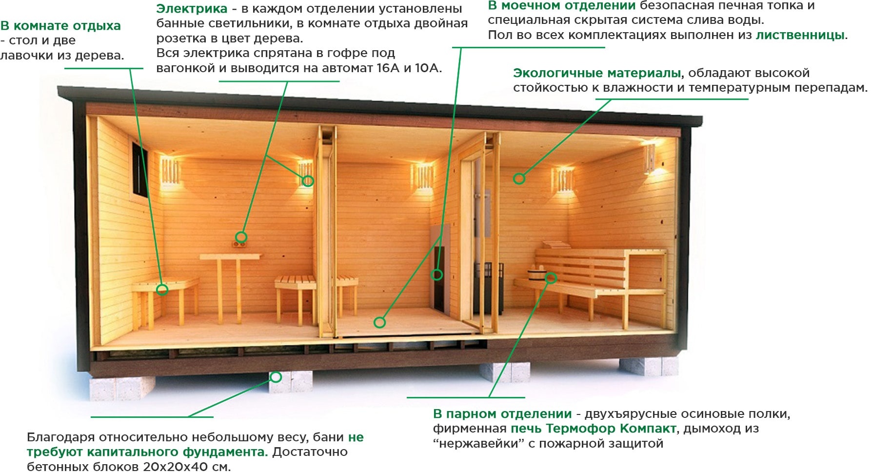 Только качественные теплоизоляционные материалы и полная герметичность. Бани быстро нагреваются и долго сохраняют тепло